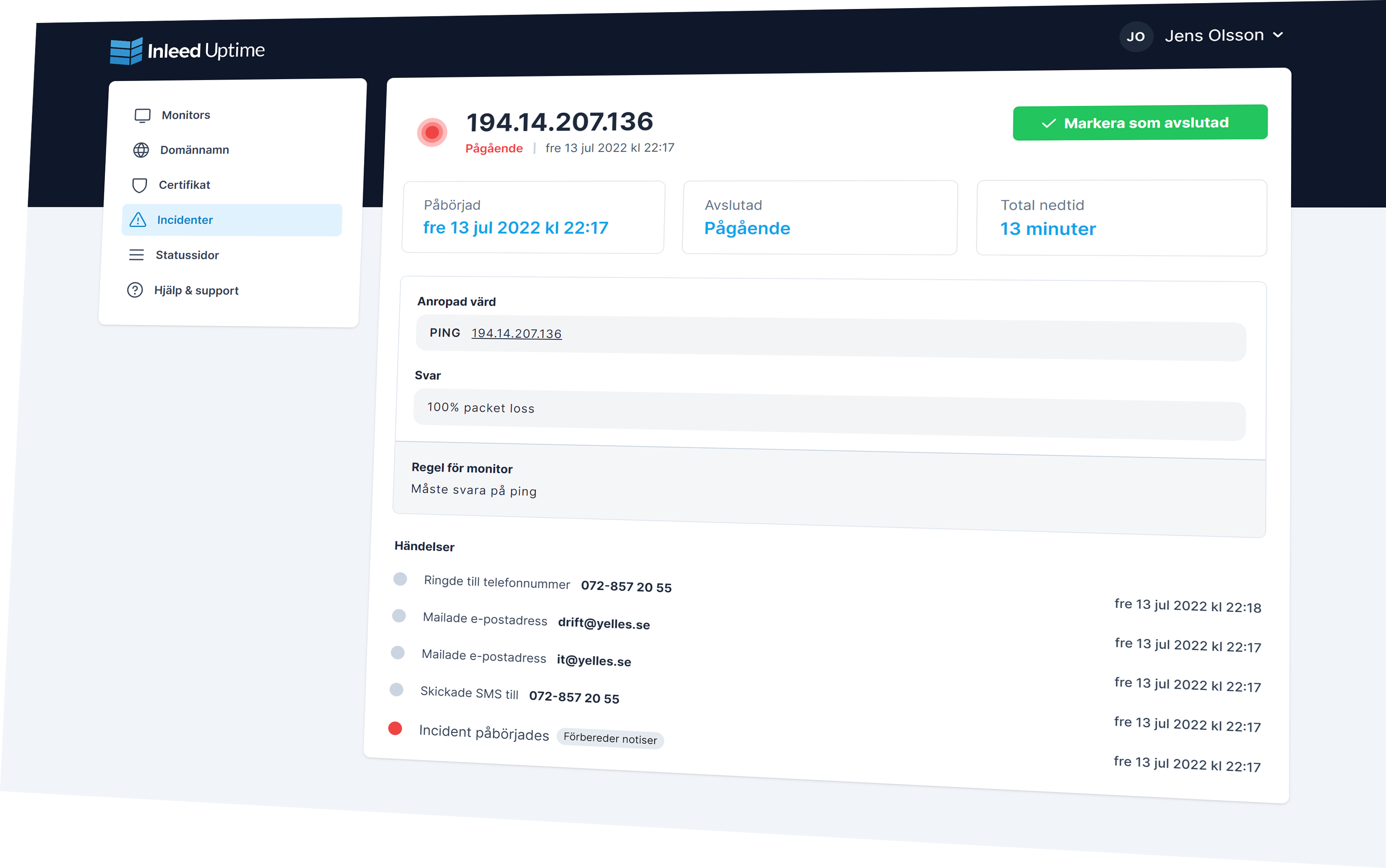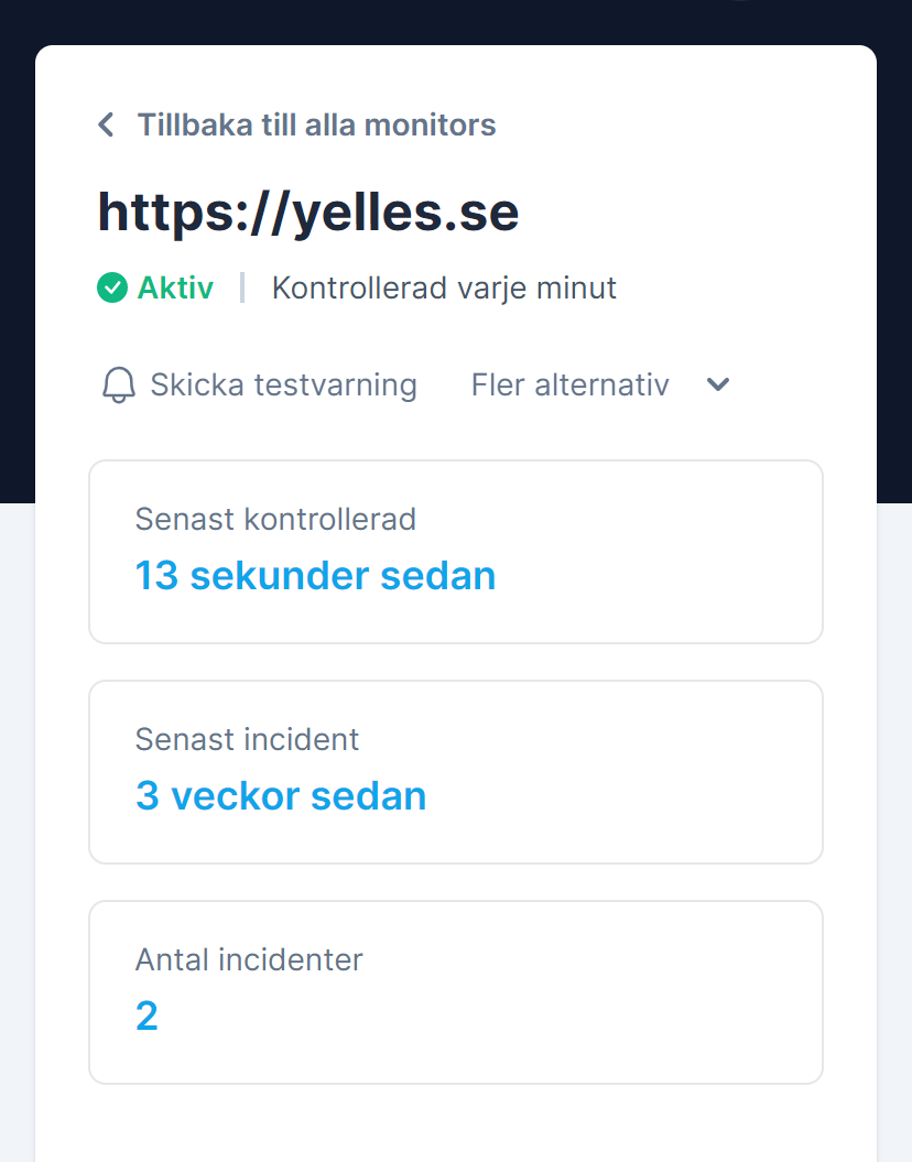 Vi kontrollerar era sajter varje minut, dygnet runt, och meddelar er direkt när något ligger nere.